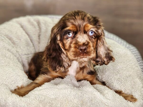 All puppies have blue eyes. Unusual coat colors like red or blue may cause dilute eye colors such as yellow gray blue or green. Feel free to call me anytime 970-901-0216.